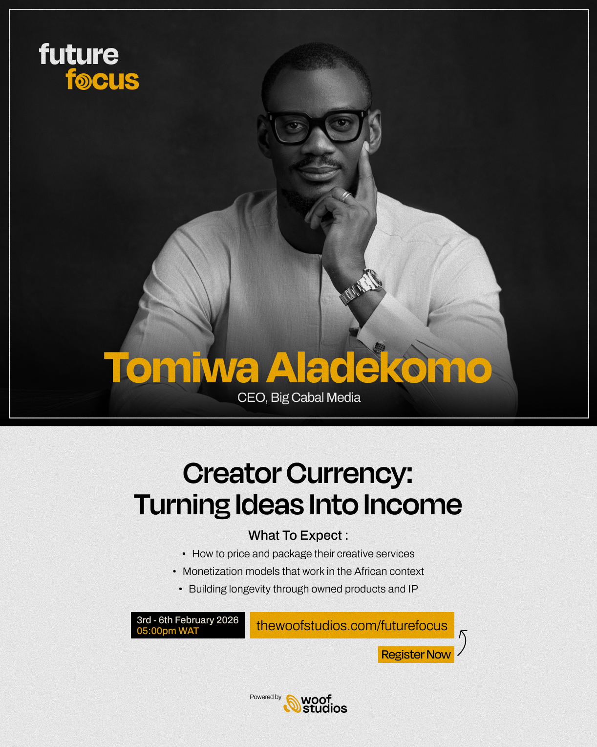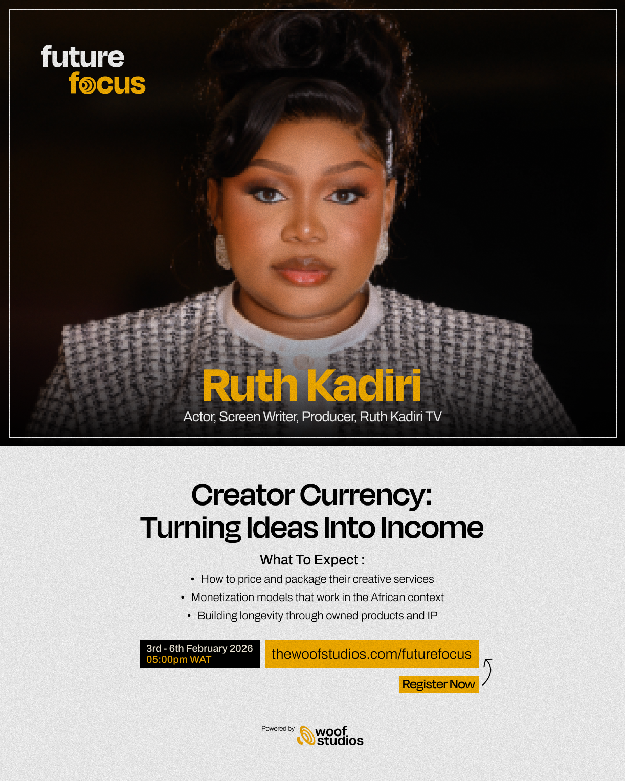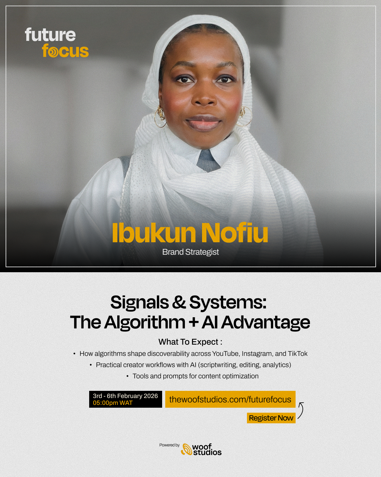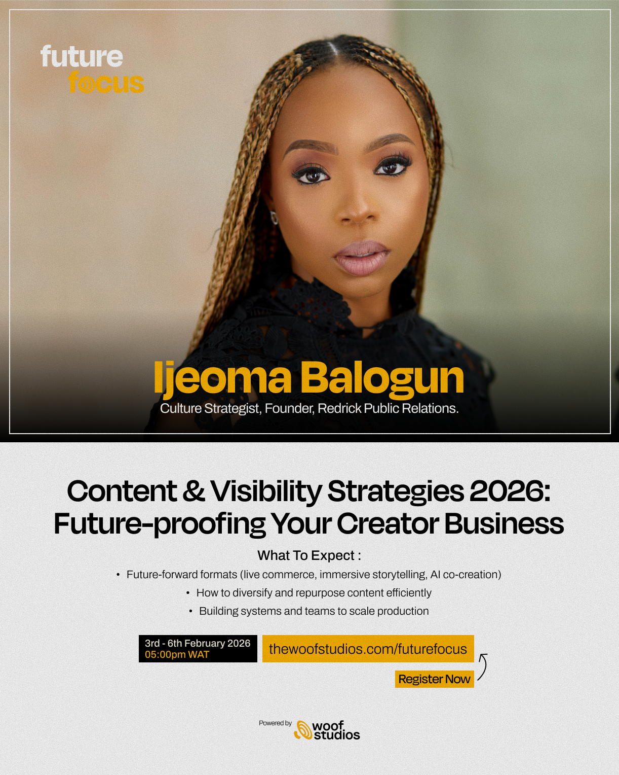 Register now at thewoofstudios.com/futurefocus for free and follow olorisupergal.com for more updates and insights on the forthcoming Future Focus virtual master class.