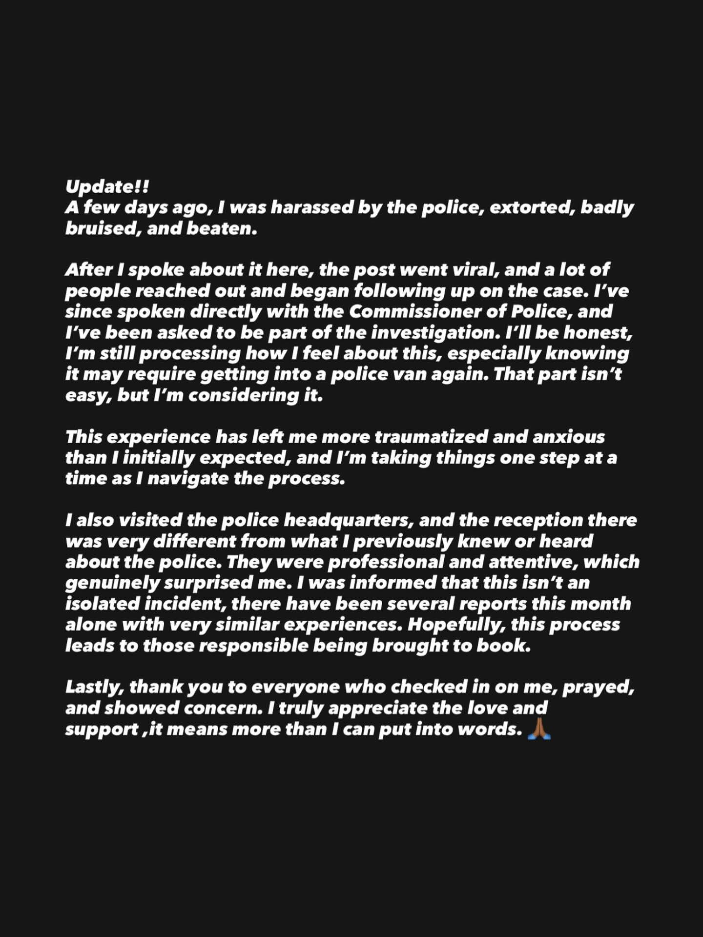 โIโm still processing how I feel about this,โ he wrote, noting that the thought of entering a police vehicle again has been particularly triggering given the trauma he endured. He described himself as anxious and deeply shaken, choosing to take the process โone step at a timeโ as he navigates the investigation.