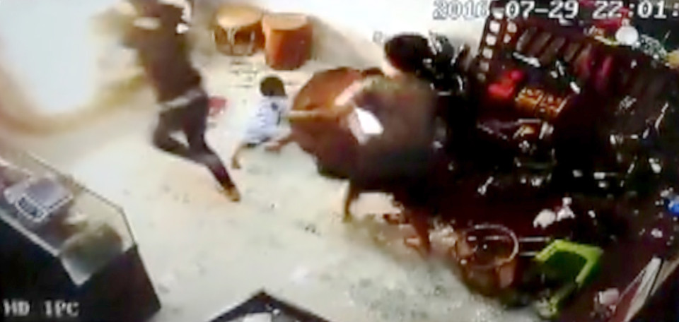 In a mobile phone recording of the footage taken from in Sanwei, South China, Peng and his mum can be seen inside the shop when the headlights of Liโs vehicle suddenly shine through the shop window.
